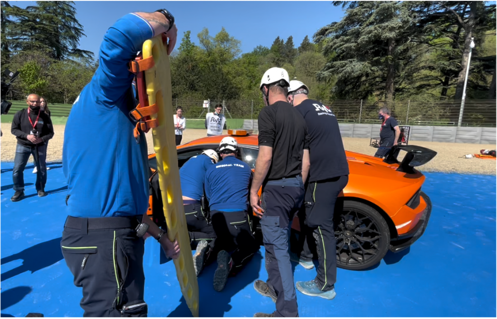Divided into groups, they were taken to the event venue in several Racing Medical Team ambulances directly at the circuit. Once on scene, rescuers were able to learn the various rapid extrication techniques on the traumatized pilot, watching the extrication team’s simulation demonstrations and then attempting to stabilize the two patients using high-fidelity simulators.